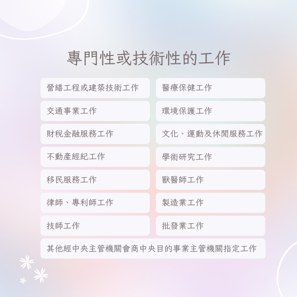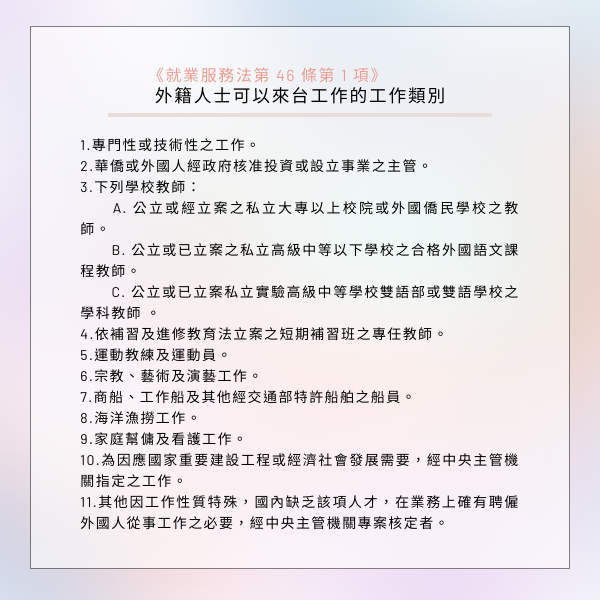 在《就業服務法》第 46 條第 1 項有規定外籍人士可以來台工作的工作類別,那我們來看看吧!