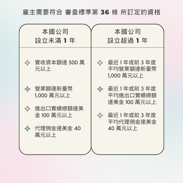 除了員工工作資格之外,在僱用外國人之前,雇主也需要達到審查標準第 36 條內的規定,才可以僱用外國人。